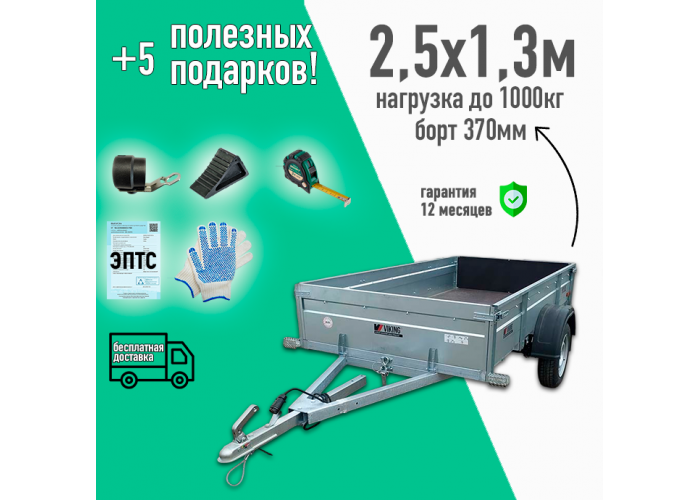 Бортовой прицеп VIKING 1325 - лучший помощник в бытовых перевозках. Усиленный прицеп, предназначенный для перевозки массивных грузов: ведение хозяйства, строительство, рыбалка и охота, путешествия и туризм, бизнес